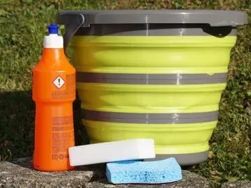 Mit reinem Wasser vom Gartenschlauch den festen Schmutz oder Vogeldreck etwas lösen und anschliessend abspritzen. Eventuell hilft auch eine Behandlung mit einer weichen Bürste und Gallseife oder verdünntem Abwaschmittel. Die Reinigungslauge mit einem Schwamm aufschäumen und den Schaum auf die Schmutzstellen geben und etwa 15-20 Minuten einwirken lassen.